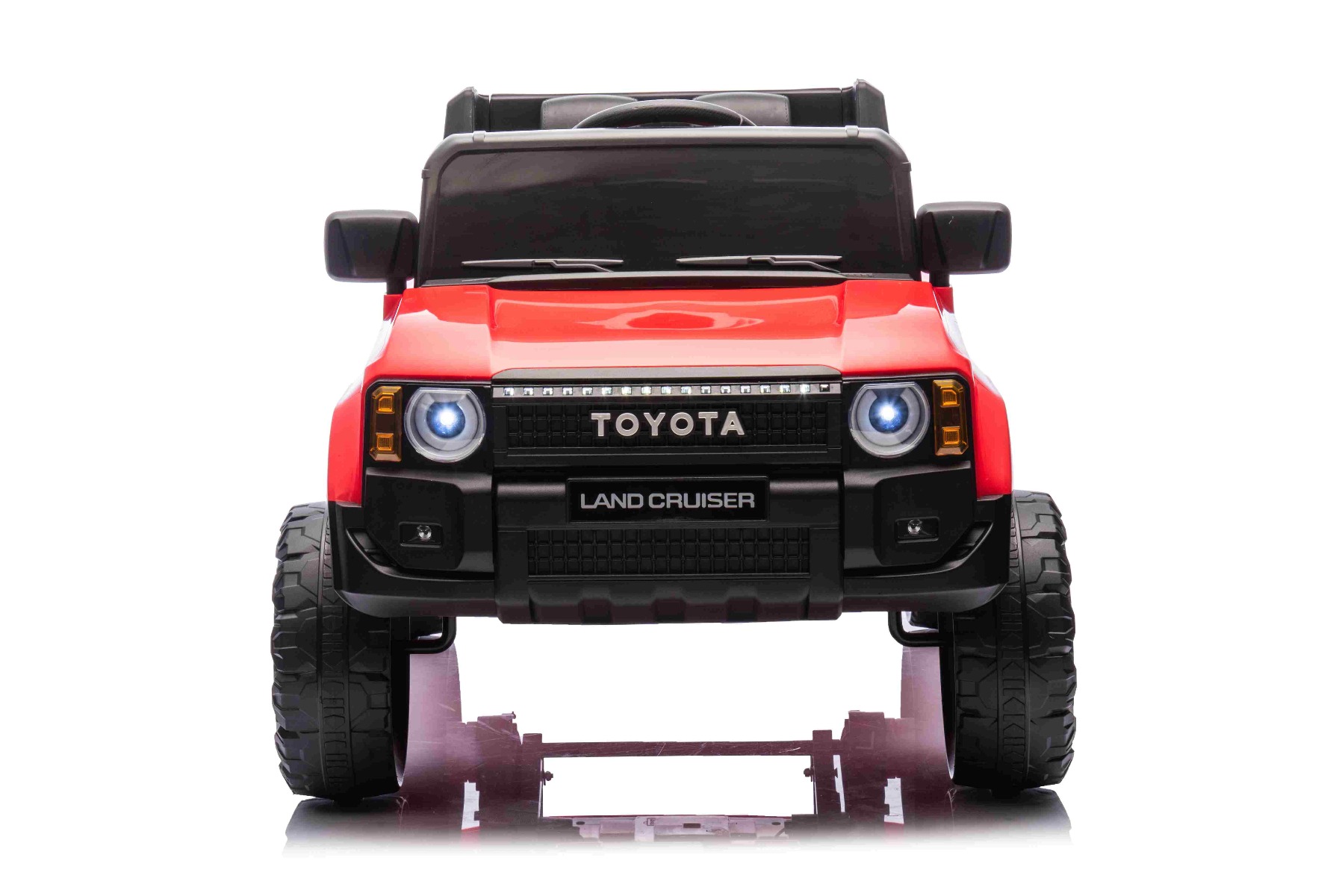 Elektromos kisautó Toyota Landcruiser 12V, piros színben, széles egyszemélyes ülés, 2,4 GHz távirányító, USB / AUX bemenet, Bluetooth, felfüggesztés, lítium akkumulátor, LED világítás, 2 x 25W motor, EREDETI licenc