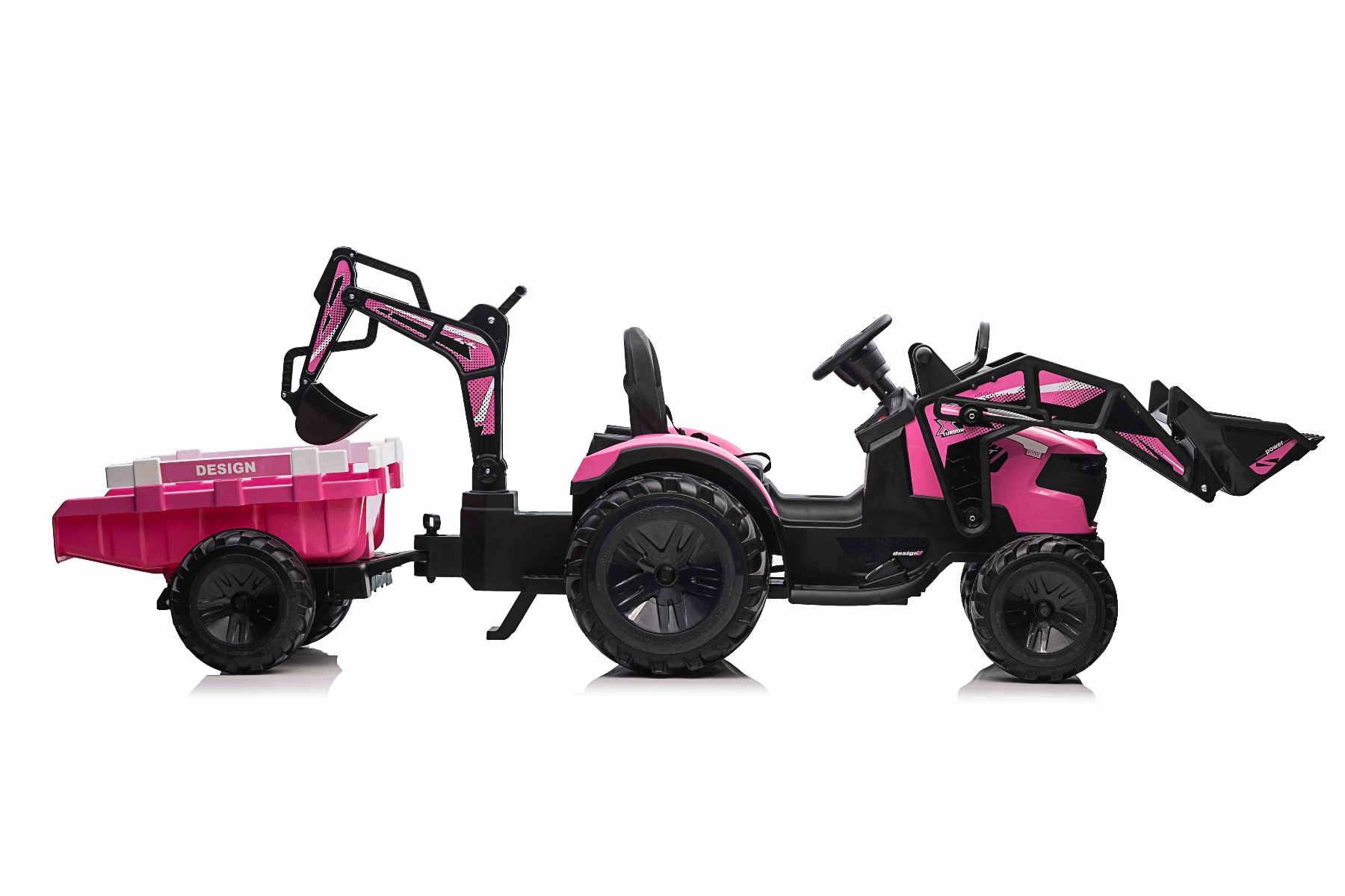 TOP-WORKER 12V elektromos traktor kanállal és pótkocsival, Egyszemélyes, Rózsaszín, puha PU ülés, 2,4 GHz távirányítóval, MP3 lejátszó USB bemenettel, Hátsó meghajtás, 2 x 45 W-os motor, EVA kerekek, Lítium akkumulátor